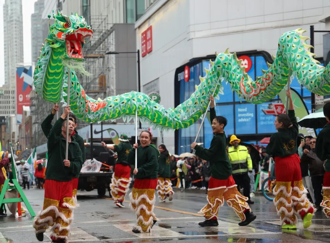 當(dāng)?shù)貢r間2025年3月16日,加拿大多倫多,在慶祝愛爾蘭民族傳統(tǒng)節(jié)日圣帕特里克節(jié)(St. Patrick’s Day)的大游行中,一支中式舞龍隊(duì)舞動綠色長龍。中新社記者 余瑞冬 攝