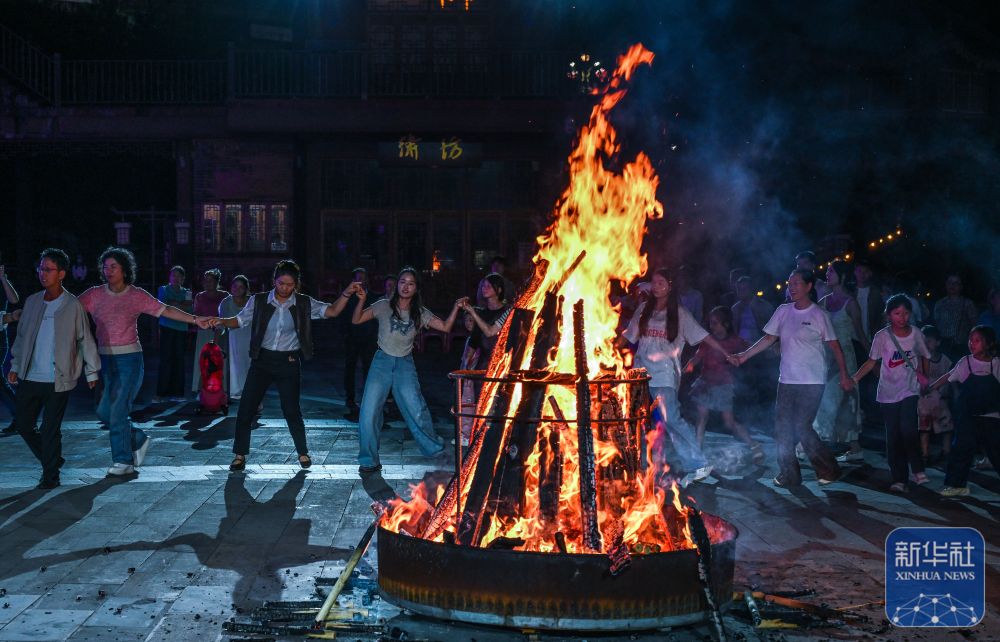 ↑ 10月5日晚,在貴州省晴隆縣阿妹戚托小鎮(zhèn),游客與當?shù)厝罕妵艋鸸参琛P氯A社記者 楊文斌 攝
