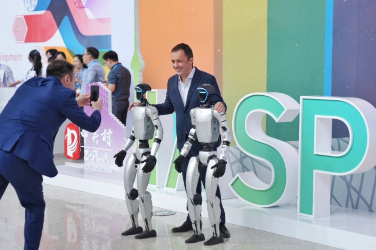 2025年9月17日,國際科技園及創(chuàng)新區(qū)域協(xié)會(IASP)2025年世界大會在北京國家會議中心開幕。圖為外籍嘉賓在大會現(xiàn)場同機器人合影。中新社記者 張祥毅 攝