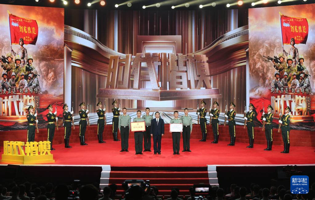 在“時代楷模”發(fā)布儀式上,陸軍某合成旅合成二營裝甲步兵一連(“劉老莊連”)官兵代表領(lǐng)取“時代楷模”獎牌和證書(9月29日攝)。新華社發(fā)(華夏 攝)