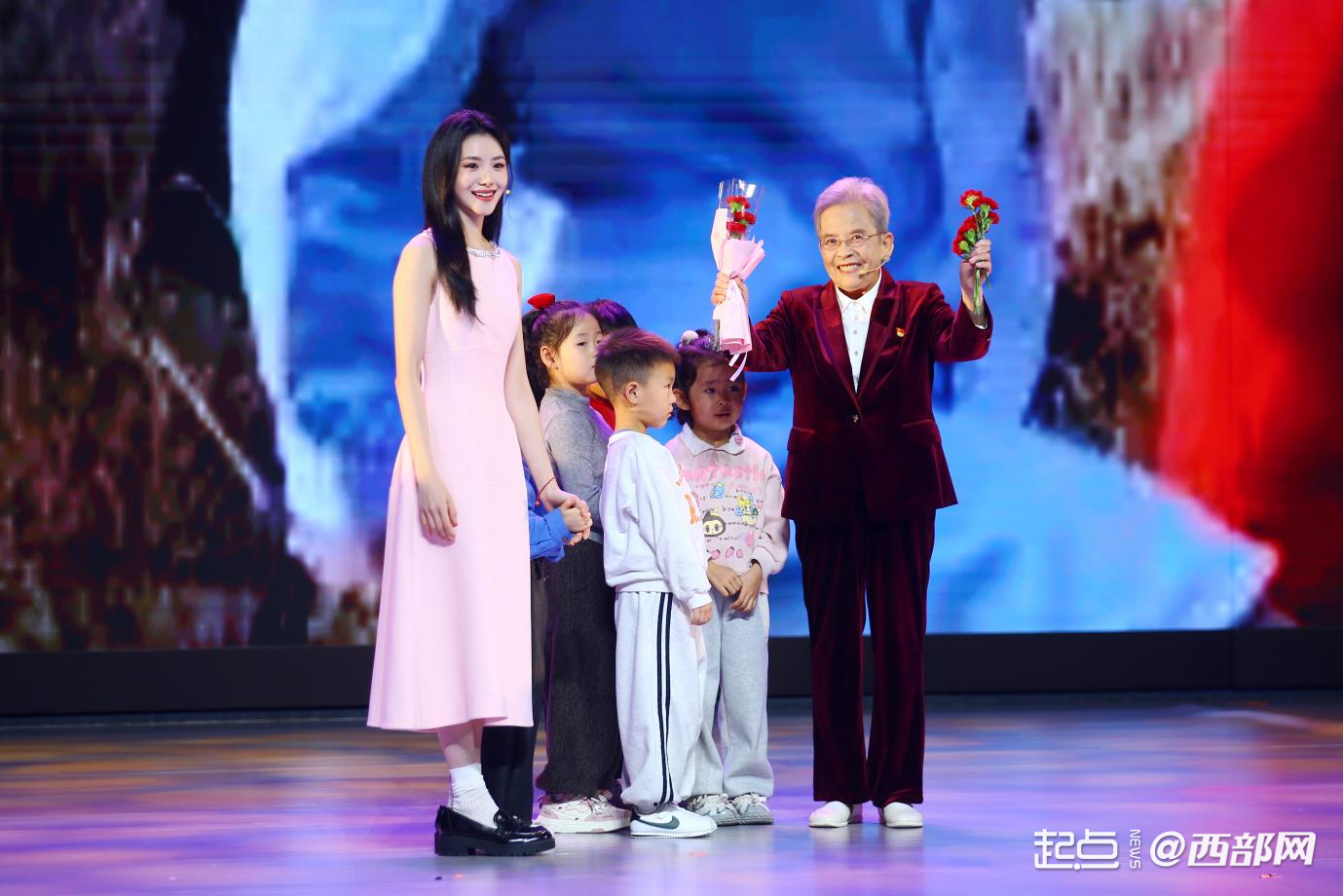 啟動(dòng)儀式現(xiàn)場,演員劉浩存牽著小朋友們?yōu)槁飞匪蜕硝r花。