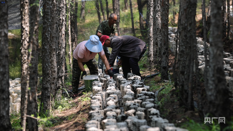 村民在馬鞍山林場林下經(jīng)濟(jì)試驗示范基地采摘木耳(央廣網(wǎng)發(fā) 劉德胤 攝)