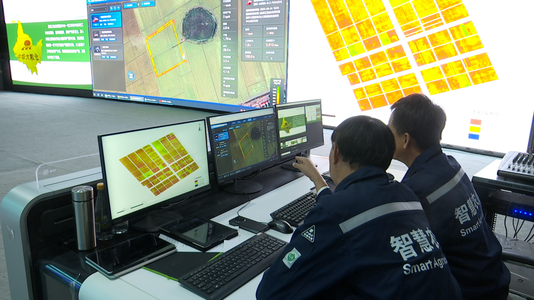 工作人員通過智慧農業(yè)數(shù)字指揮平臺研判水稻成熟度(央廣網(wǎng)發(fā) 李延生 攝)