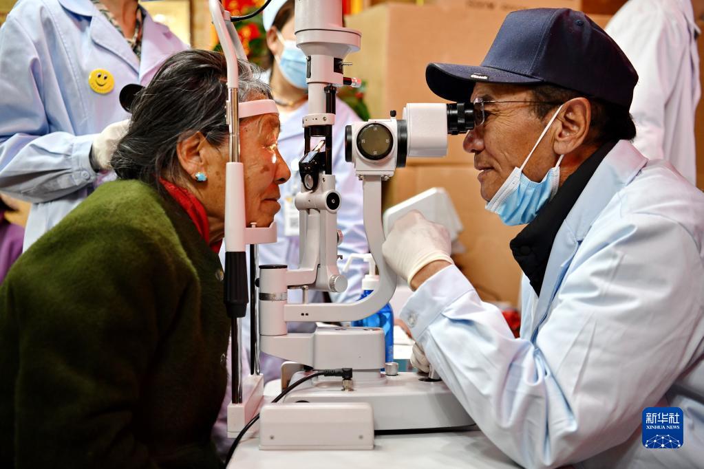 5月9日,醫(yī)務(wù)人員為八廓社區(qū)的居民檢查眼睛。新華社記者 張汝鋒 攝