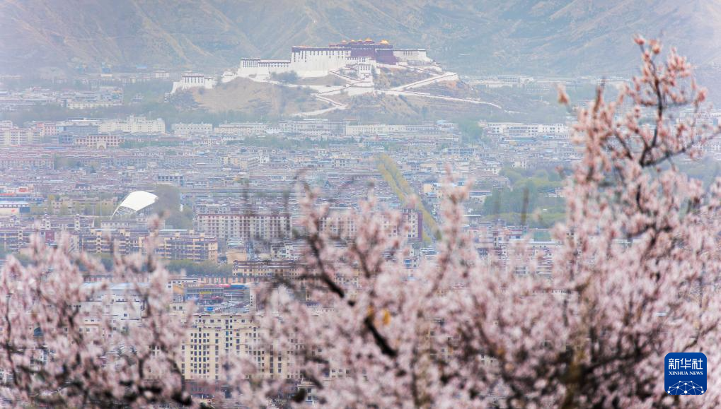 在位于拉薩北部的古剎帕邦喀附近拍攝的盛開的桃花,遠(yuǎn)處是布達(dá)拉宮(4月9日攝)。新華社記者 丁增尼達(dá) 攝