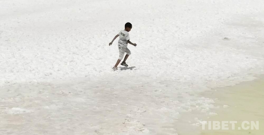 圖為在察爾汗鹽湖岸邊玩耍的小朋友 攝影:劉莉