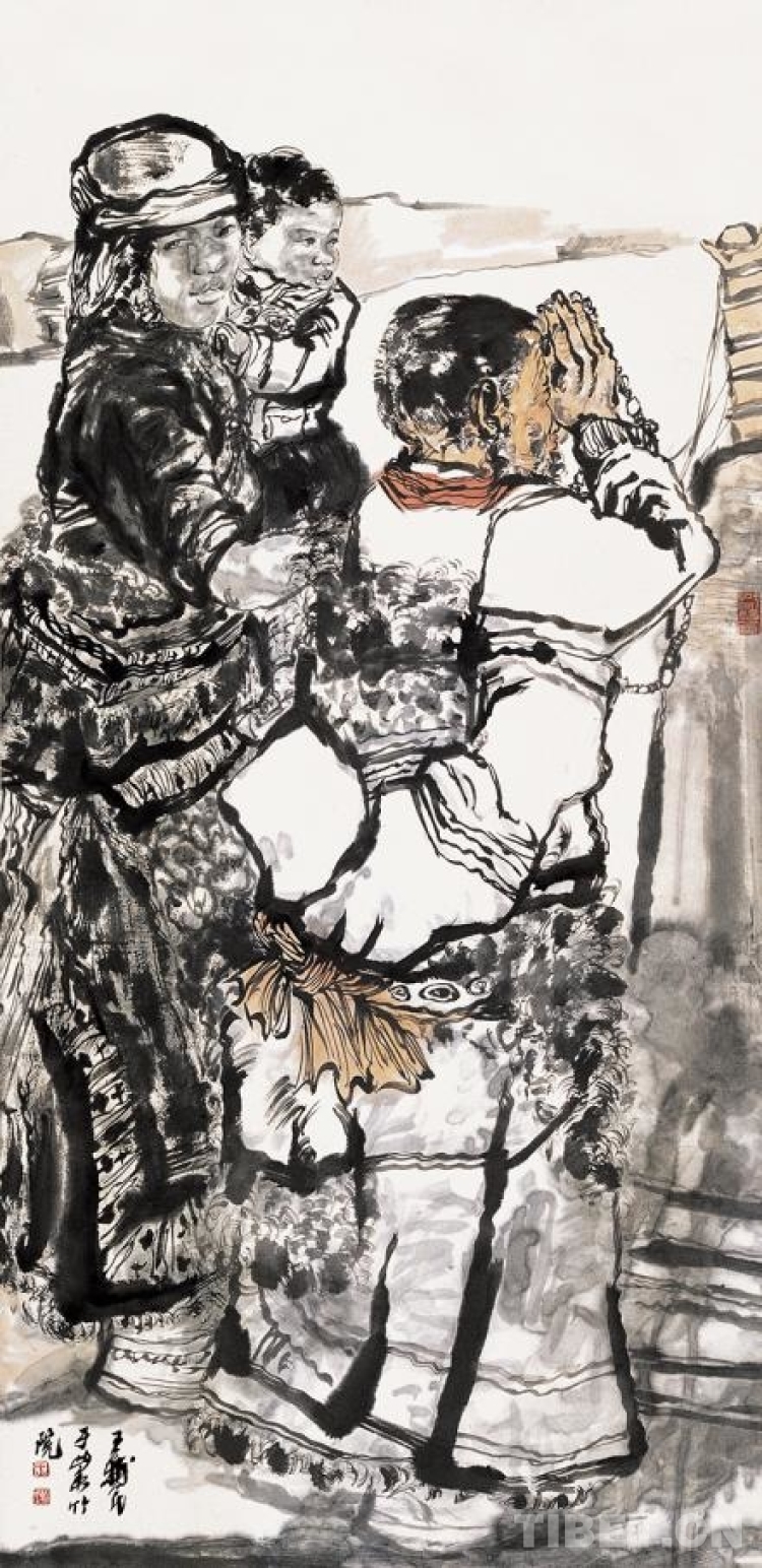 “真正深入當(dāng)?shù)厝ンw驗(yàn)藏族群眾的生活,創(chuàng)作出來的作品才會真實(shí)感人?!蓖踺o民在談到藏族題材的創(chuàng)作感悟時(shí)說,“青藏高原最吸引人的地方是生活在這里的人們飽滿的精神狀態(tài)。我們要敬畏自然,尊重文化,保持充滿感情、充滿崇敬之情的創(chuàng)作情感和態(tài)度,用中國畫的水墨形式去表現(xiàn)藏族群眾的生活,去表現(xiàn)雪域的蒼茫與藏族群眾頑強(qiáng)不屈的性格,表現(xiàn)人與自然的關(guān)系?!?/p>