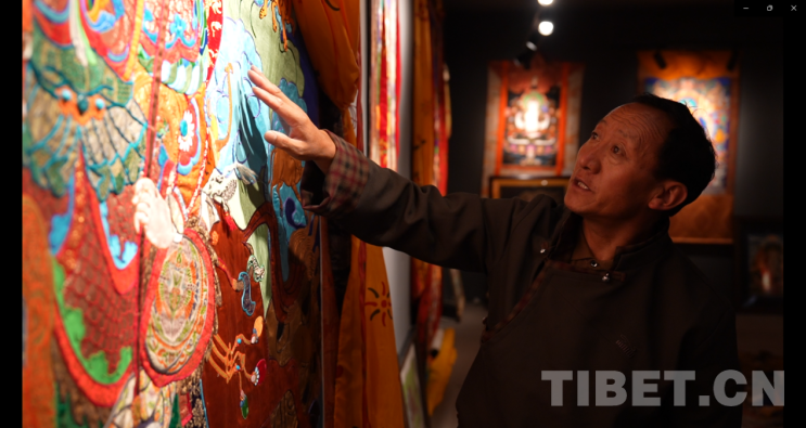 圖為國家級(jí)非遺項(xiàng)目拉薩堆繡唐卡傳承人羅布在介紹自己的唐卡作品 攝影:謝林翰