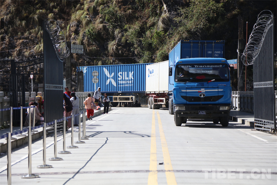 圖為樟木口岸國(guó)門(mén)正在通關(guān)的車(chē)輛