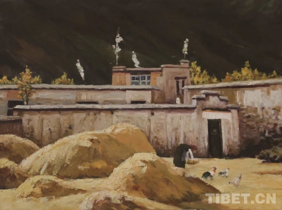 圖為“藍天白云——雪域高原油畫作品巡展”作品《金秋農(nóng)舍》(60x80cm 布面油畫)作者:丹增朗杰