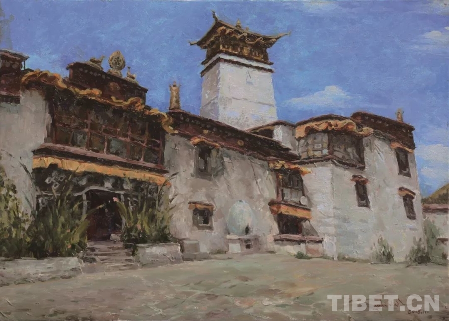 圖為“藍天白云——雪域高原油畫作品巡展”作品《桑嘎古多》(50x70cm 布面油畫)作者:扎西次仁