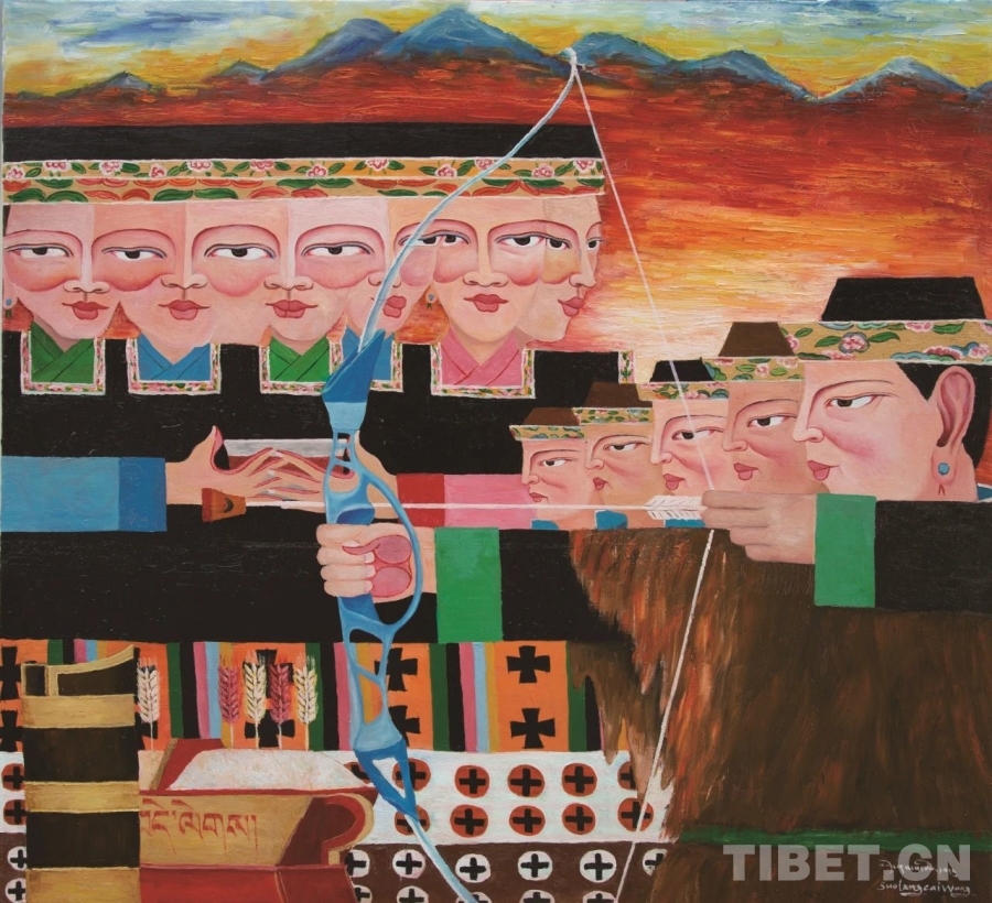 圖為“藍天白云——雪域高原油畫作品巡展”作品《工布響箭》(100x110cm 布面油畫)作者:索朗才旺