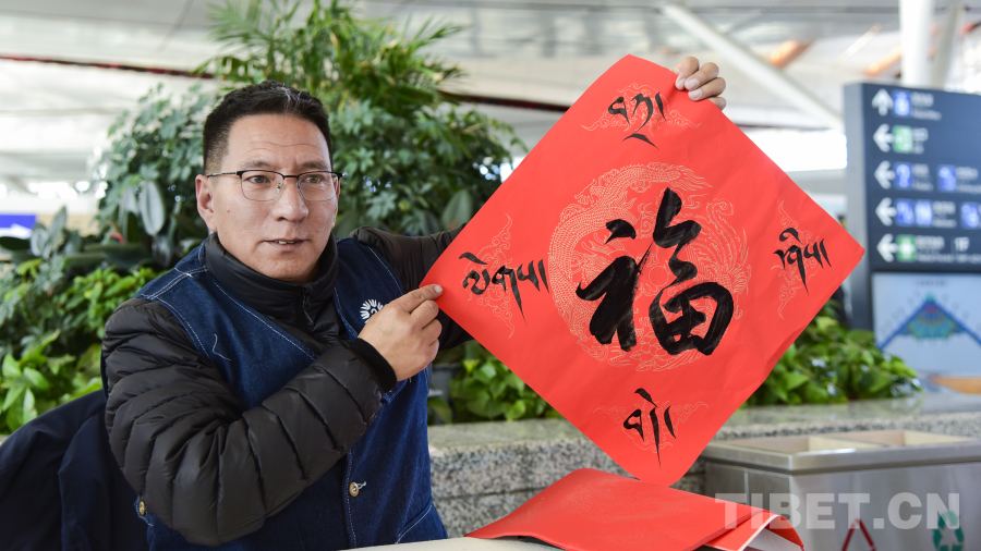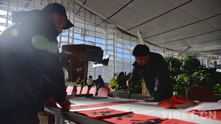 活動(dòng)現(xiàn)場,29名西藏文藝志愿者走進(jìn)拉薩貢嘎國際機(jī)場航站樓,開展送“?!弊?、送“扎西德勒”、送春聯(lián)、扎木念彈唱等活動(dòng),為過往旅客和工作人員帶來了一場別開生面的文化體驗(yàn)。
