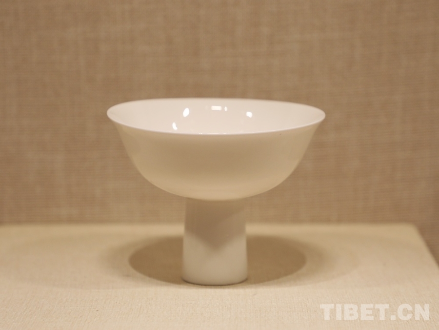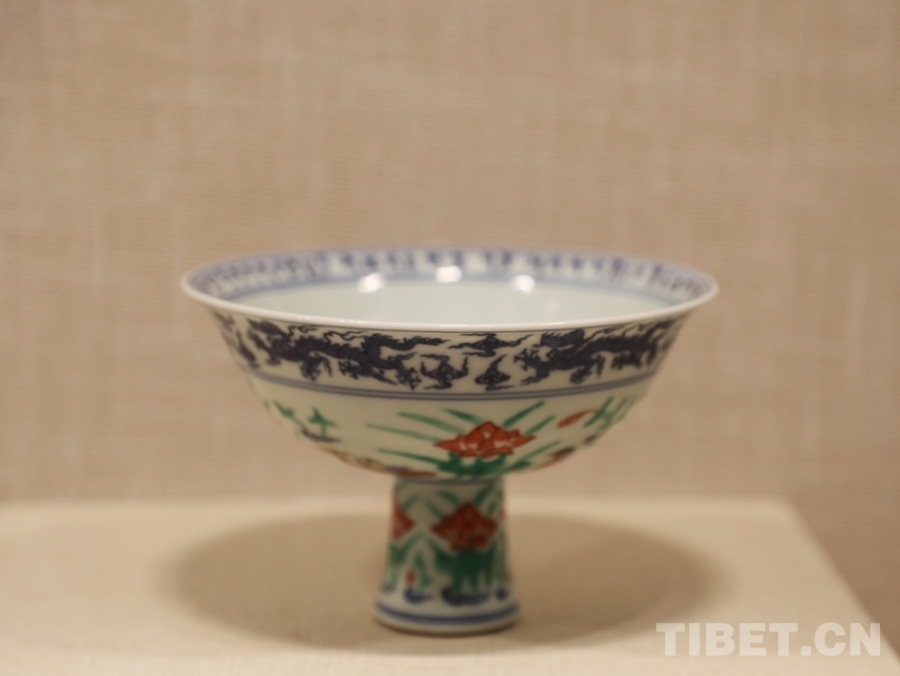 圖為明宣德青花五彩蓮池鴛鴦紋高足碗。經鑒定,這只內沿書寫著藏文的高足碗是明代中央政府向薩迦寺賜送的實物見證 攝影:王茜