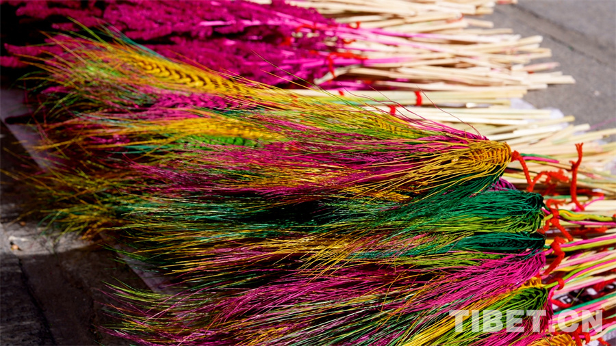 在藏歷新年年貨物品中,提及酥油花就不得不提它的“搭檔”“羅薩梅朵”,正是因?yàn)樗鼈兊难b點(diǎn)讓藏歷新年中本身就已很精致的“切瑪盒”更加亮眼。“羅薩梅朵”被稱(chēng)為“冬季里最美麗的花”,是經(jīng)過(guò)染色的麥穗和青稞穗制作成的“花卉”。在藏歷新年或節(jié)日之時(shí),人們將其插在盛滿(mǎn)糌粑和青稞的“切瑪盒”上,寓意新的一年美滿(mǎn)、豐收。