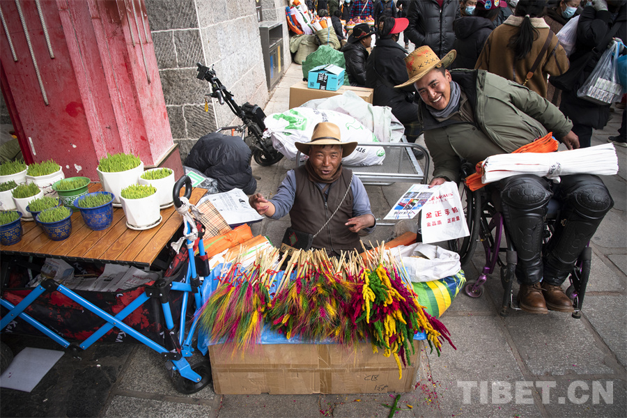 普瓊,來(lái)自日喀則市江孜縣,在八廓商城南門(mén)前經(jīng)營(yíng)著自己的“羅薩梅朵”小攤。初見(jiàn)普瓊,我們被他沖著鏡頭的燦爛笑容所吸引。細(xì)細(xì)觀(guān)察,普瓊坐在地上的身高卻比別人矮了一大截?!拔覀儚睦_堆龍德慶的批發(fā)市場(chǎng)上買(mǎi)來(lái)這批‘羅薩梅朵’在此銷(xiāo)售,就希望能夠在年前的這段時(shí)間多賺些小錢(qián)補(bǔ)貼家用,所有人都想在新年之時(shí)過(guò)個(gè)充裕的‘好年’,不是嗎?”普瓊因一次意外高位截癱,失去雙腿的他并沒(méi)有消沉。他選擇積極面對(duì)生活,用自己的雙手和命運(yùn)抗?fàn)?,用?jiān)強(qiáng)和勤勞讓自己和全家過(guò)上更好的生活。與普瓊不幸的經(jīng)歷相比,我們每個(gè)人過(guò)的每個(gè)年何嘗不都是一個(gè)個(gè)“好年”呢?普瓊對(duì)生活的那種熱愛(ài),對(duì)明天會(huì)更好的堅(jiān)定,何嘗不是我們對(duì)每一個(gè)“好年”所孜孜追求的呢?