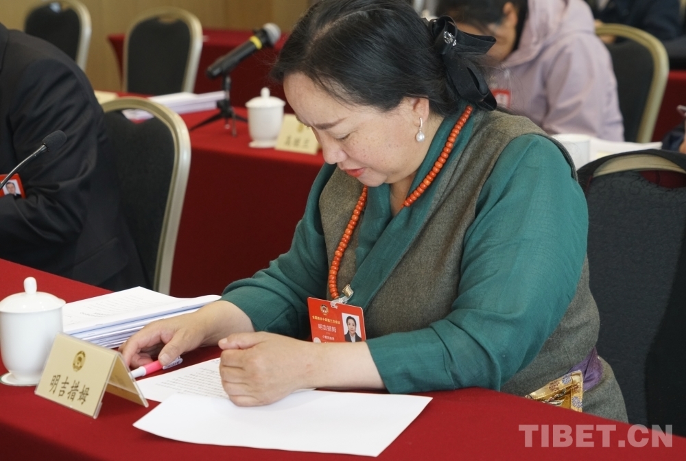 圖為明吉措姆在全國政協(xié)十四屆三次會(huì)議民族界小組會(huì)議上發(fā)言攝影:楊眉笑