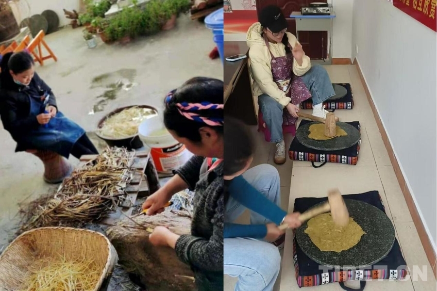 關(guān)于藏紙的起源,學(xué)術(shù)界更偏向《舊唐書(shū)·吐蕃》中的記載:唐高宗時(shí)期,吐蕃贊普葉宗弄贊(注:松贊干布)“因請(qǐng)蠶種及造酒、碾、磑、紙、墨之匠”,隨文成公主入藏。自此,西藏關(guān)于紙的技藝因地而成,代代相傳。1300多年后的一個(gè)清晨,在金東鄉(xiāng)的工坊內(nèi),記者見(jiàn)到了金東藏紙制造技藝非遺傳承人加里,也看到了藏紙一大分支——金東藏紙中的古法脈搏。