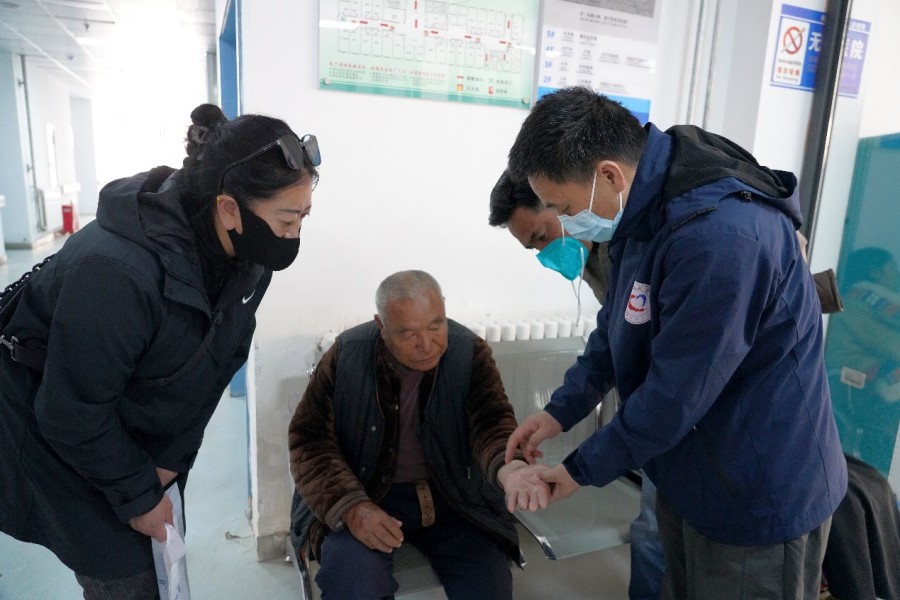 圖為兩位專家正在為老人進(jìn)行診斷
