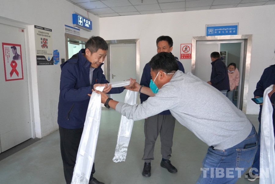圖為患者家屬正在為兩名醫(yī)生敬獻(xiàn)哈達(dá)