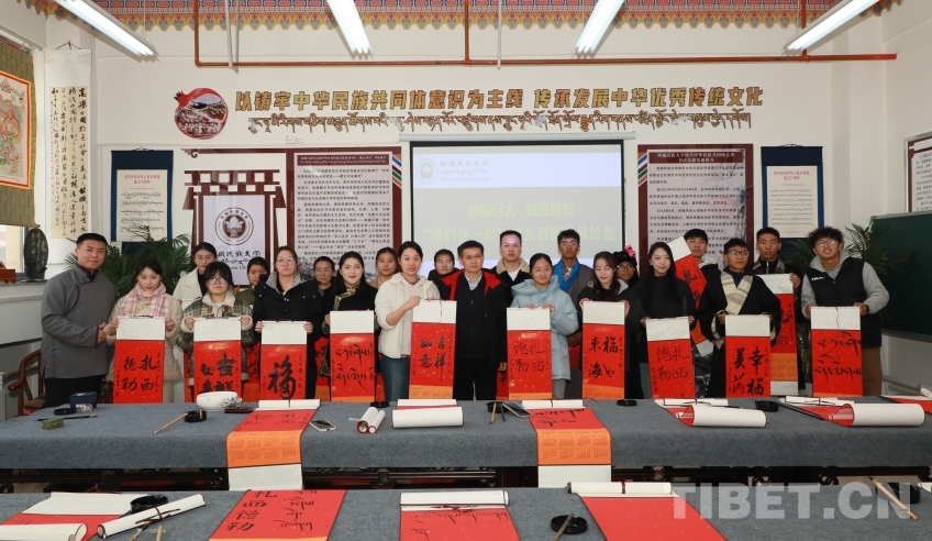 走進(jìn)西藏民族大學(xué)社科樓里內(nèi)的“鑄牢中華民族共同體意識(shí)書法實(shí)踐基地”,基地負(fù)責(zé)人扎西曲杰正帶領(lǐng)他的小伙伴書寫書法作品。指著一幅幅書法作品,扎西曲杰自豪地說(shuō),我們基地的各族學(xué)生用“寫”在一起的形式傳承中華優(yōu)秀傳統(tǒng)文化,推廣國(guó)家通用語(yǔ)言文字,助力中華民族共同體建設(shè)。