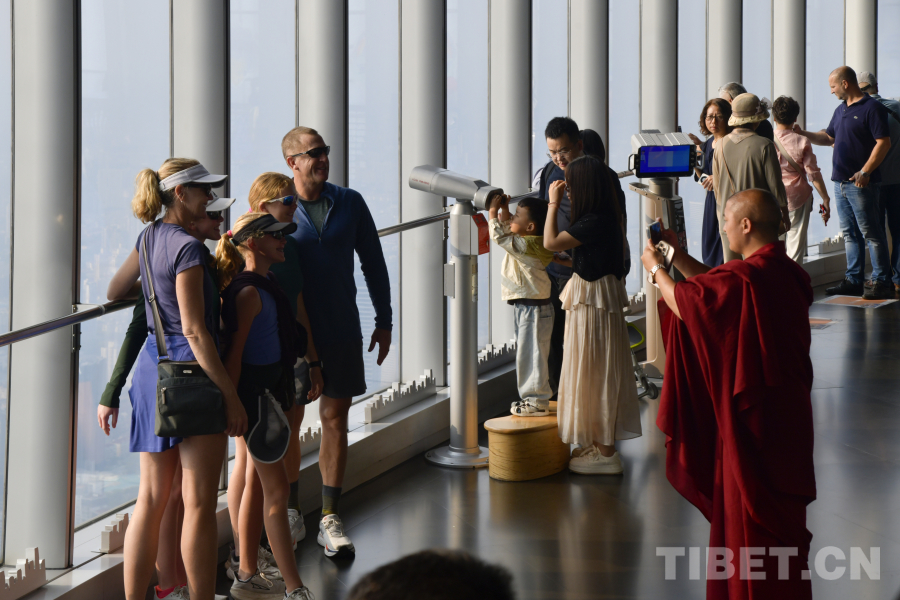 圖為西藏佛學(xué)院學(xué)員在上海中心大廈為外籍游客拍照打卡 攝影:趙振宇