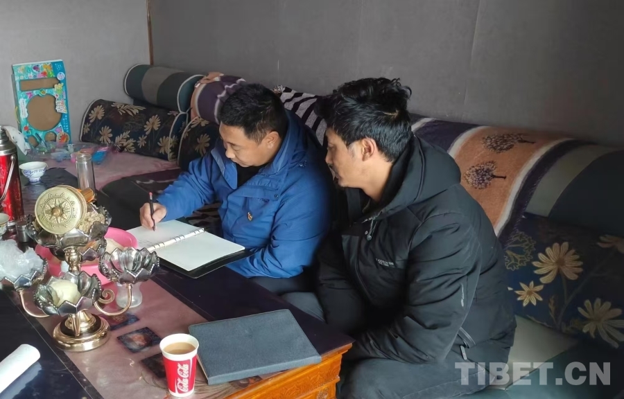 圖為老沙開周(左)在當曲村管護員家中了解相關(guān)工作