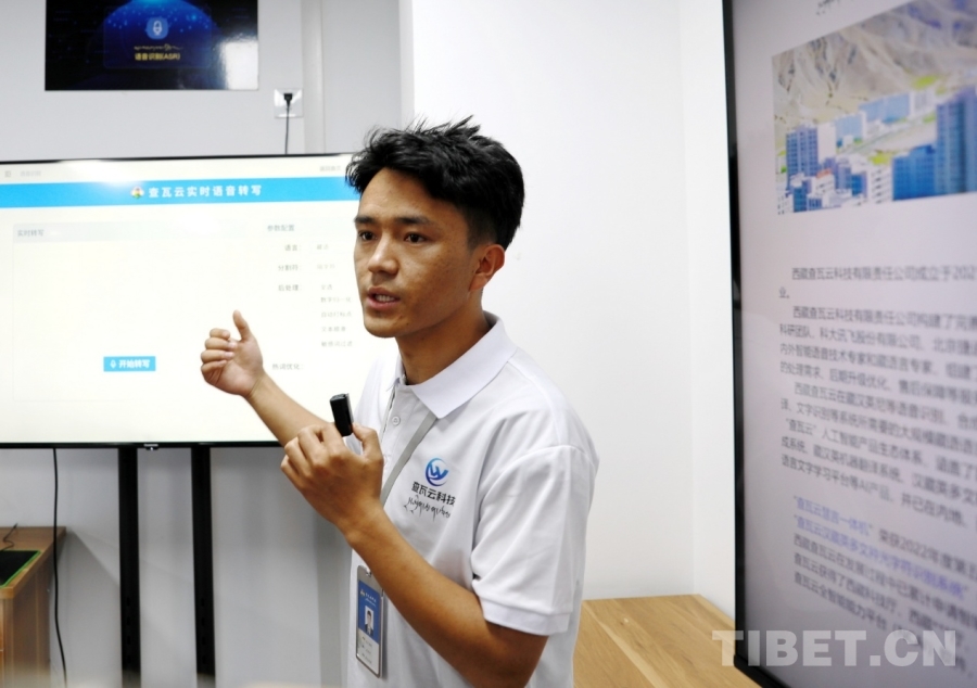 圖為西藏查瓦云科技有限責(zé)任公司副總經(jīng)理次仁桑珠介紹查瓦云實(shí)時(shí)語音轉(zhuǎn)寫系統(tǒng) 攝影:劉莉