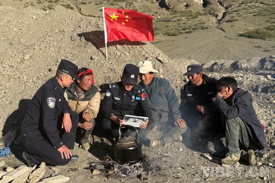圖為日喀則邊境管理支隊(duì)薩嘎邊境管理大隊(duì)昌果邊境派出所民警在海拔5300米的拉孜加久山口巡邏間隙與護(hù)邊員共同收看紀(jì)念中國人民抗日戰(zhàn)爭(zhēng)暨世界反法西斯戰(zhàn)爭(zhēng)勝利80周年大會(huì) 攝影:旦增扎巴