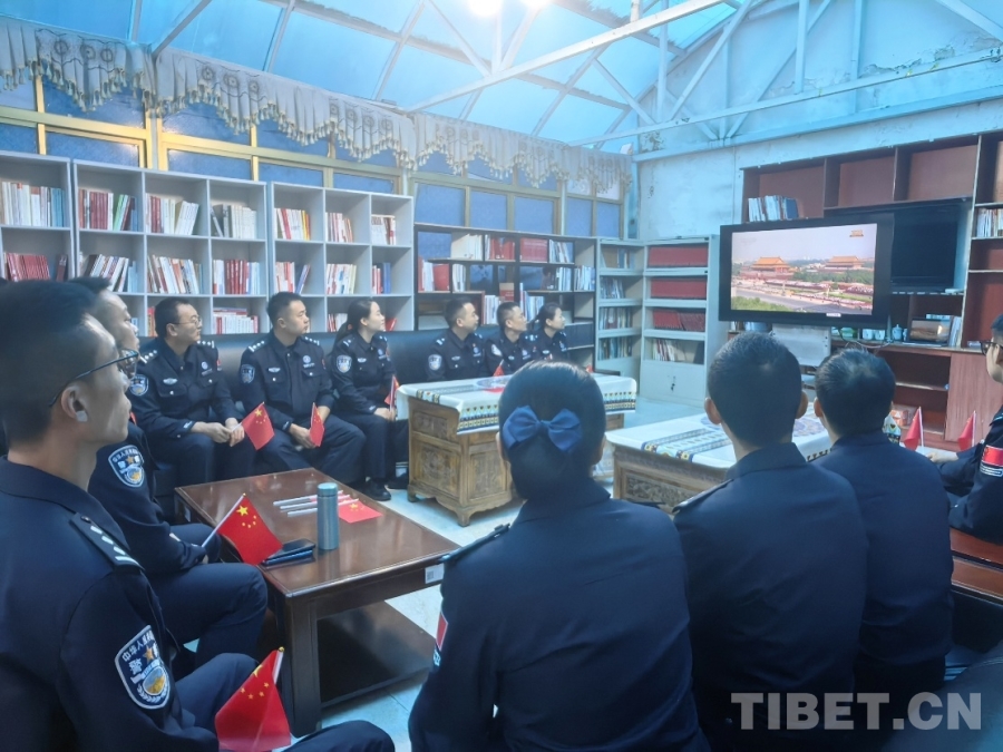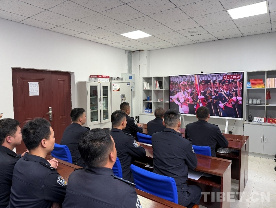 圖為日喀則邊境管理支隊(duì)康布邊境派出所組織全體民警觀看紀(jì)念中國人民抗日戰(zhàn)爭(zhēng)暨世界反法西斯戰(zhàn)爭(zhēng)勝利80周年大會(huì) 攝影:周偉