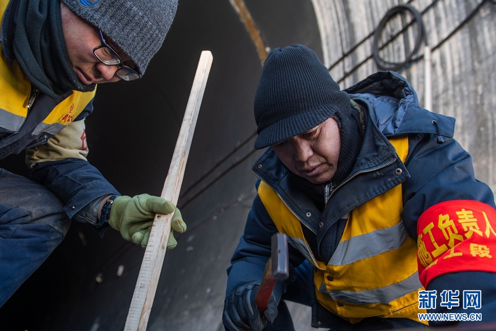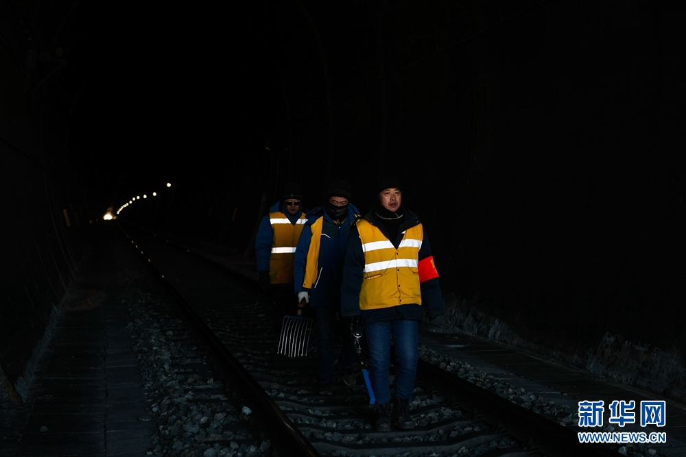 隧道內(nèi)凜冽寒風(fēng)吹得人幾乎站不住腳,呼呼的風(fēng)穿透身體。鄂年明頂著風(fēng),手拿測量工具,走走停停,還不時跪在零下三四十度的鋼面上,仔細查看線路平順情況。