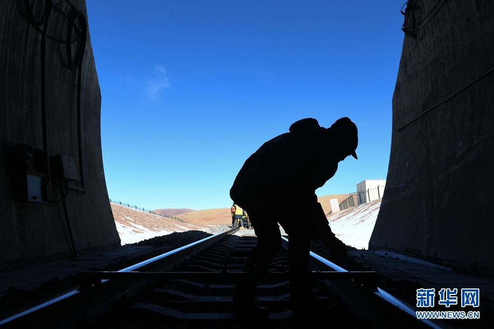 中國鐵路青藏集團公司格爾木工務(wù)段秀水河線路車間的職工在風(fēng)火山隧道口進行撥道作業(yè)。