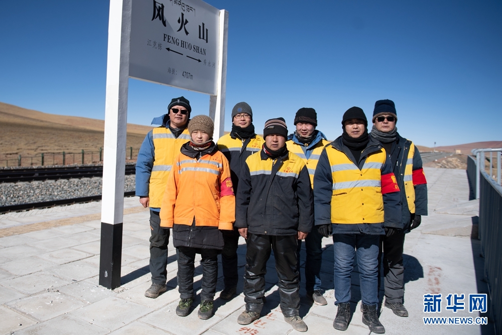 鄂年明(右二)和工友在海拔4707米的風(fēng)火山車站合影留念。