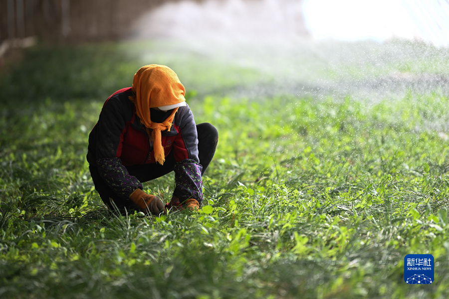 3月23日,藥農(nóng)在青海省海西蒙古族藏族自治州德令哈市柯魯柯鎮(zhèn)的藏紅花大棚內(nèi)除草。新華社記者 張龍 攝