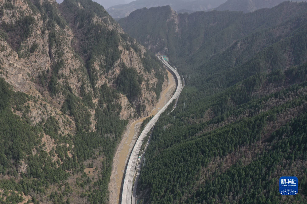 這是4月28日在青海省海東市互助土族自治縣拍攝的加西公路項(xiàng)目沿線風(fēng)景(無(wú)人機(jī)照片)。新華社記者 陳杰 攝