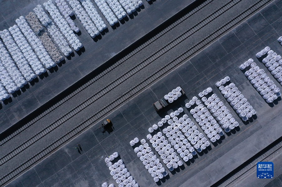 在青海鹽湖工業(yè)股份有限公司鉀肥分公司貨場(chǎng),車輛在裝運(yùn)鉀肥(無(wú)人機(jī)照片)。(資料圖)新華社記者 張龍 攝