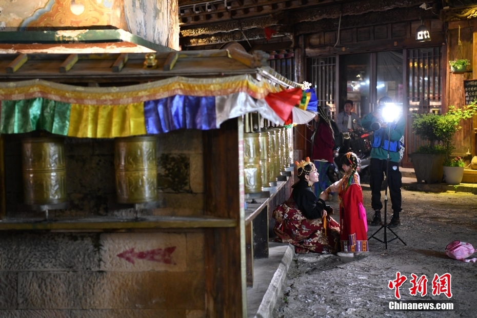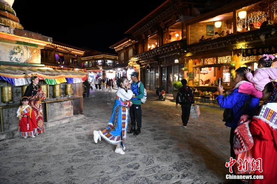 7月11日晚,游客在古城中拍照打卡。暑假期間,云南香格里拉市的旅拍市場(chǎng)火熱,游客們穿著藏族服裝變身“扎西”和“卓瑪”,在獨(dú)克宗古城留下旅行中的美好瞬間。中新社記者 劉冉陽 攝