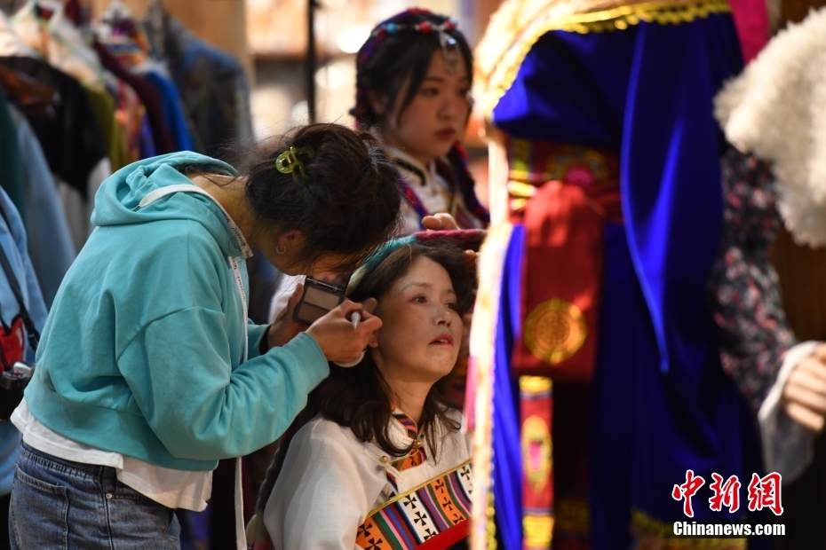7月11日晚,游客在古城中一家旅拍店化妝。暑假期間,云南香格里拉市的旅拍市場(chǎng)火熱,游客們穿著藏族服裝變身“扎西”和“卓瑪”,在獨(dú)克宗古城留下旅行中的美好瞬間。中新社記者 劉冉陽 攝