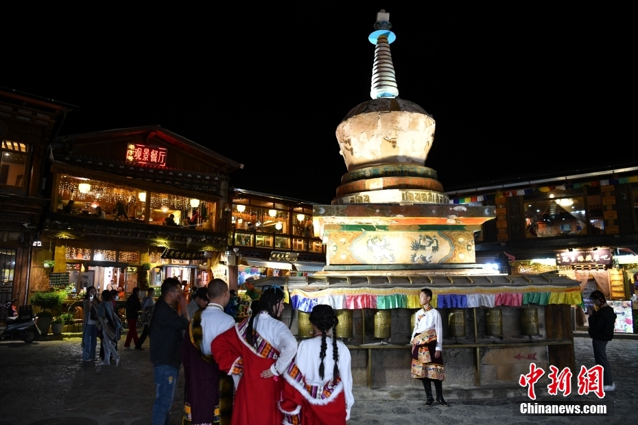 7月11日晚,游客在古城中打卡留念。暑假期間,云南香格里拉市的旅拍市場(chǎng)火熱,游客們穿著藏族服裝變身“扎西”和“卓瑪”,在獨(dú)克宗古城留下旅行中的美好瞬間。中新社記者 劉冉陽 攝