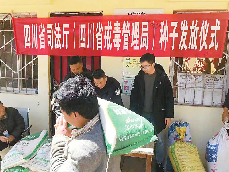 司法廳免費向白玉縣村民發(fā)放種子和化肥。