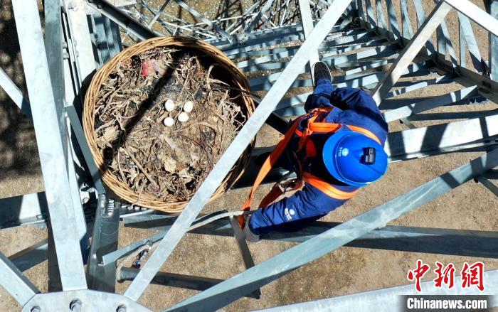 圖為國(guó)網(wǎng)青海省電力公司工作人員正在檢查人工鳥(niǎo)巢的情況。國(guó)網(wǎng)青海省電力公司供圖