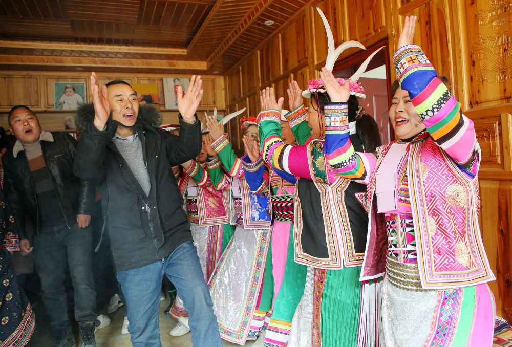 平武縣白馬藏族鄉(xiāng)伊瓦岱惹村的村民們挨家逐戶跳“曹蓋”唱山歌拜年。胡宇 攝