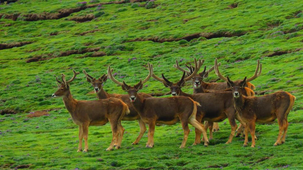 在青海省玉樹(shù)藏族自治州曲麻萊縣曲麻河鄉(xiāng)昂拉村拍攝的白唇鹿(2018年8月6日攝)。新華社 濤西昂扎攝