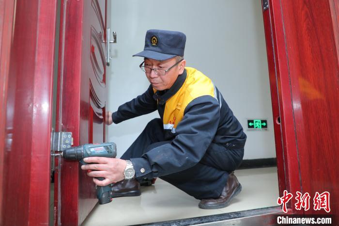 圖為梁軍使用手電鉆修理辦公室大門合頁。周悅翔 攝