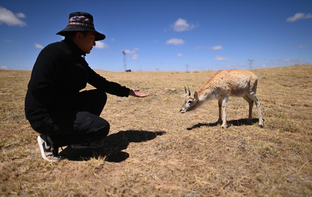 在可可西里國家級自然保護區(qū)索南達杰保護站,巡山隊員扎西桑周在野生動物救助中心內(nèi)與一只被救助的小藏羚羊互動(5月30日攝)。新華社記者 張宏祥 攝
