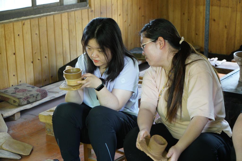“啪、啪、啪……”清脆而富有節(jié)奏的拍打聲此起彼伏,不斷響起。一群游客圍坐一圈,專心致志地聽著講解。他們左手勻速轉(zhuǎn)動(dòng)底部輪盤,右手持木板輕輕拍打。不一會(huì)兒,每個(gè)人面前的杯狀陶坯都已初步成型。