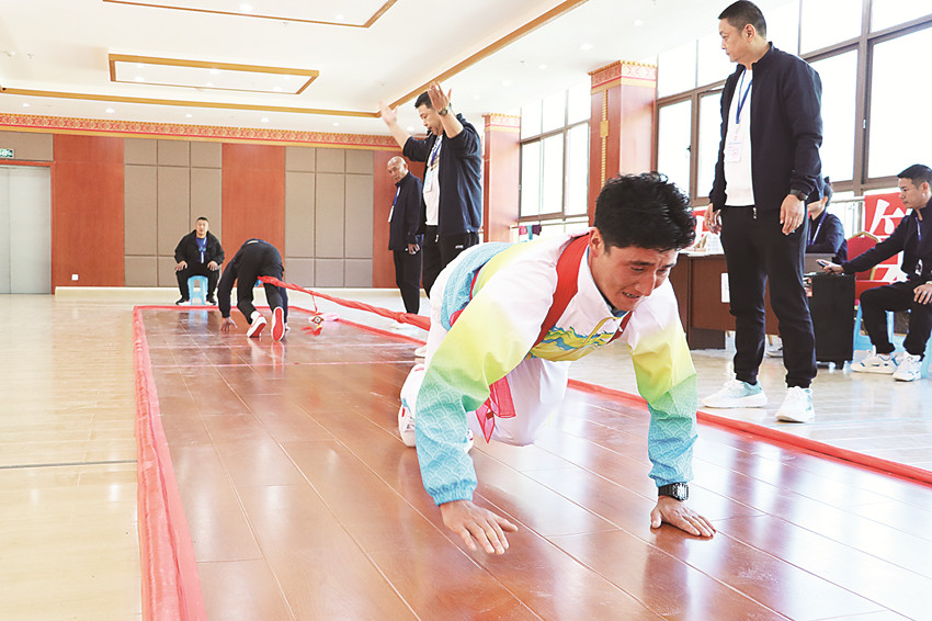 “參賽選手雙手雙腳全部著地,奮力向前拉動(dòng),不僅對(duì)選手的肩背、腰腹和腿部力量要求高,更考驗(yàn)選手的爆發(fā)力和體能?!北荣愔校门虚L(zhǎng)熊安平一邊關(guān)注著賽場(chǎng),一邊向記者介紹押加比賽。