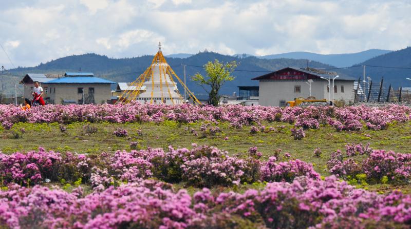 每年5月下旬至6月中旬,小中甸草原就會(huì)被多彩絢爛的杜鵑花、狼毒花以及各種不知名的小花小草包圍,變成一片花的海洋,吸引來自各地的游客駐足。這時(shí)的小中甸,每個(gè)角度都是美景,花海連著傳統(tǒng)藏族民居,以及遠(yuǎn)處的雪山和森林,恍若走進(jìn)了神話中的仙境,這里也是人們拍寫真照、婚紗照的絕好取景地。