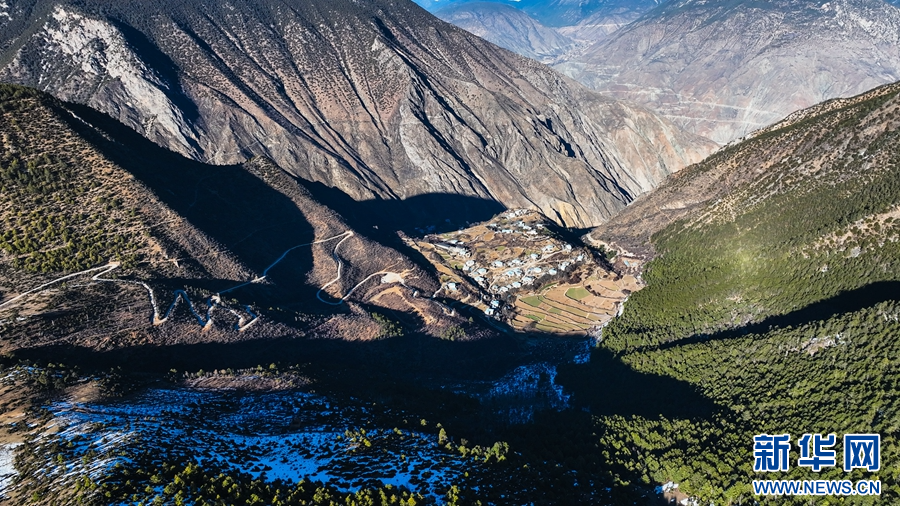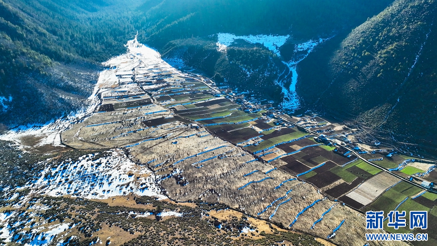 1月14日,在云南省迪慶藏族自治州德欽縣羊拉鄉(xiāng)南仁村,攝影師用無人機記錄下冬日好風光,畫面中村落被山巒環(huán)抱,山巔被皚皚白雪覆蓋,隨著鏡頭轉(zhuǎn)換,一汪翠綠的湖水映入眼簾,在陽光的照耀下,仿佛一塊翡翠。