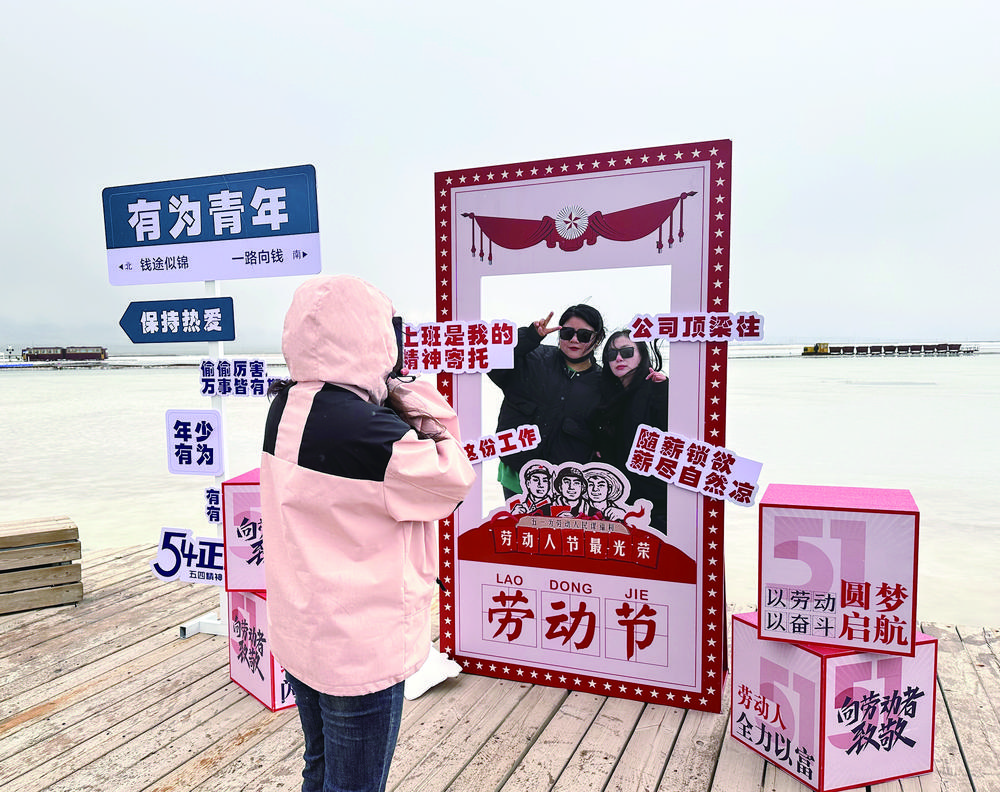 “熱愛(ài)生活”“有為青年”“向勞動(dòng)者致敬”……游客穿行在景區(qū)里,在一個(gè)個(gè)充滿生活氣息的標(biāo)語(yǔ)下打卡拍照。茶卡鹽湖景區(qū)每年都會(huì)更換沉浸式打卡裝置,今年更是增設(shè)27處以鹽湖歷史、民俗文化、鹽雕體驗(yàn)為主題的暮雪禮堂、熱氣球、水中秋千、愛(ài)心平臺(tái)、鯨落、愛(ài)心坐凳等拍攝道具,為游客提供更加豐富的拍攝體驗(yàn)。